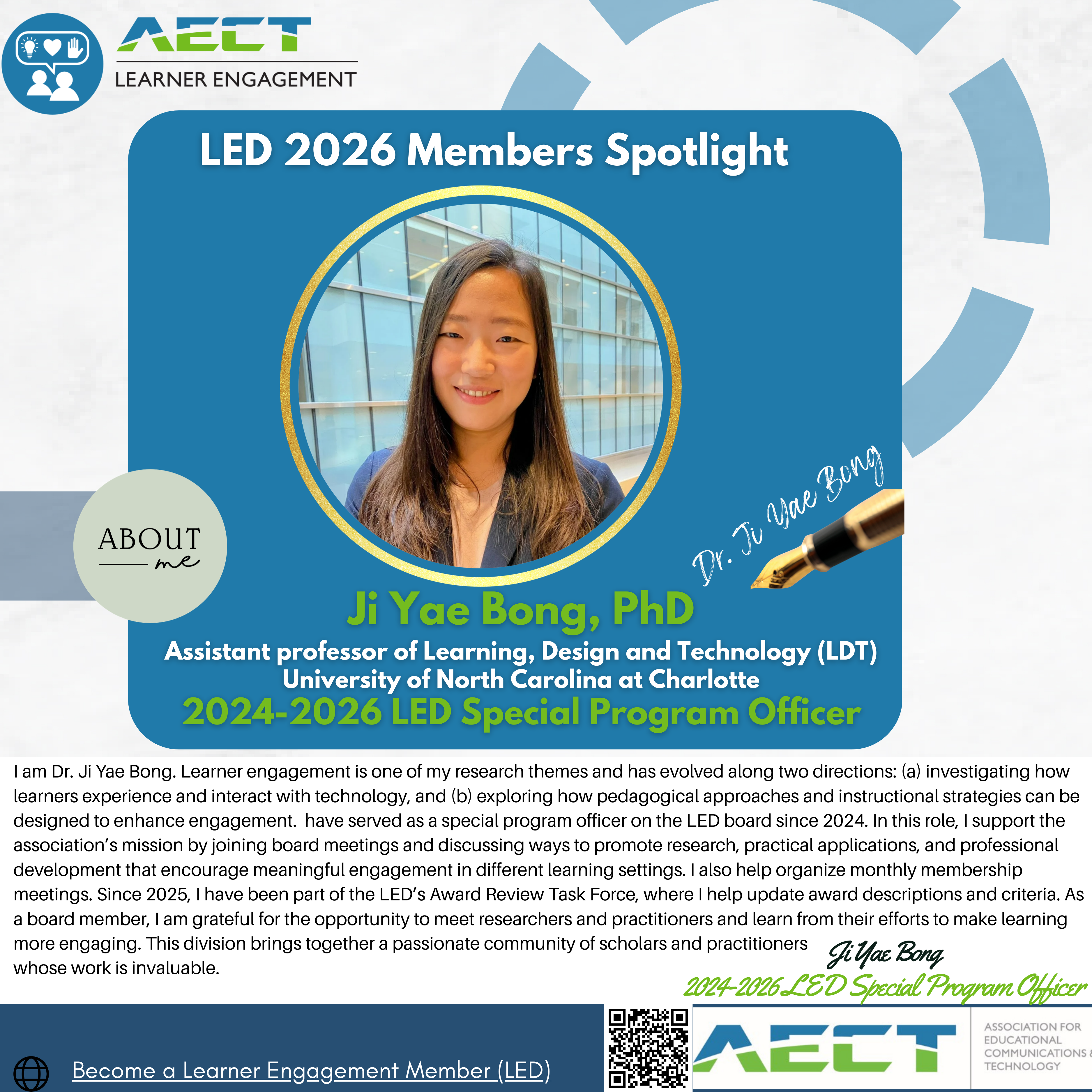 Hello, I am Ji Yae Bong, the LED Special Program Officer (2024-2026) and an Assistant Professor of Learning, Design and Technology (LDT) at the University of North Carolina at Charlotte.